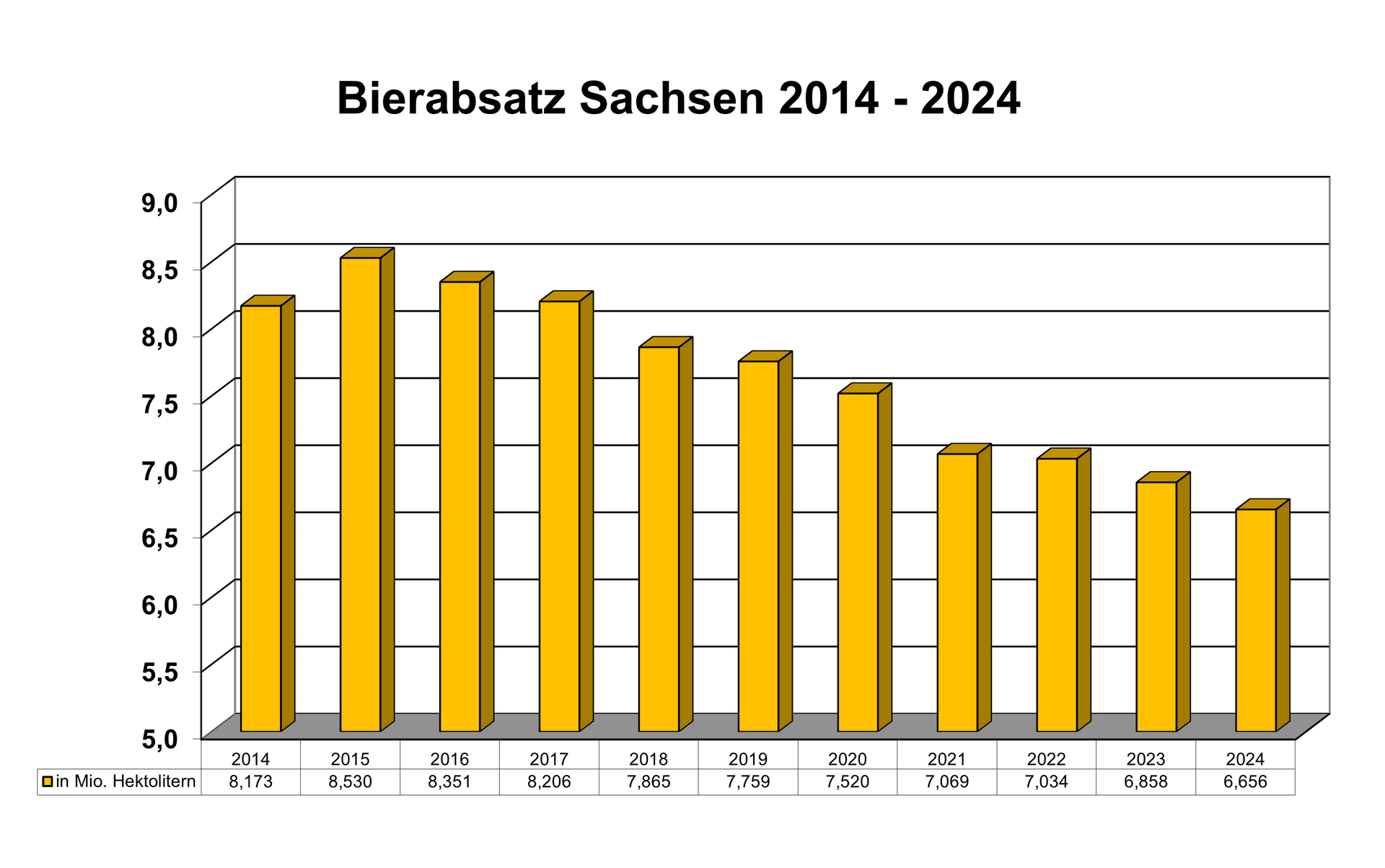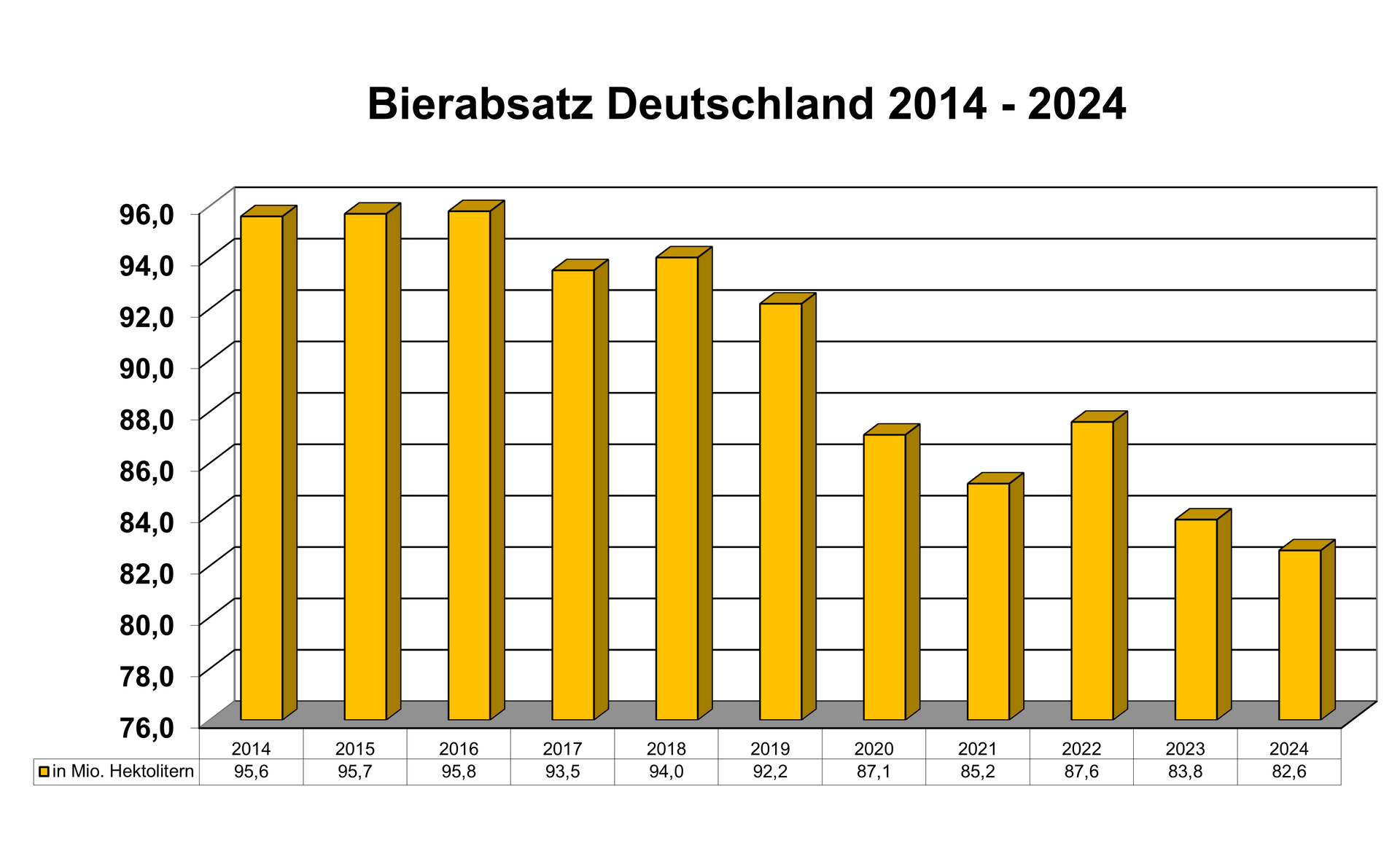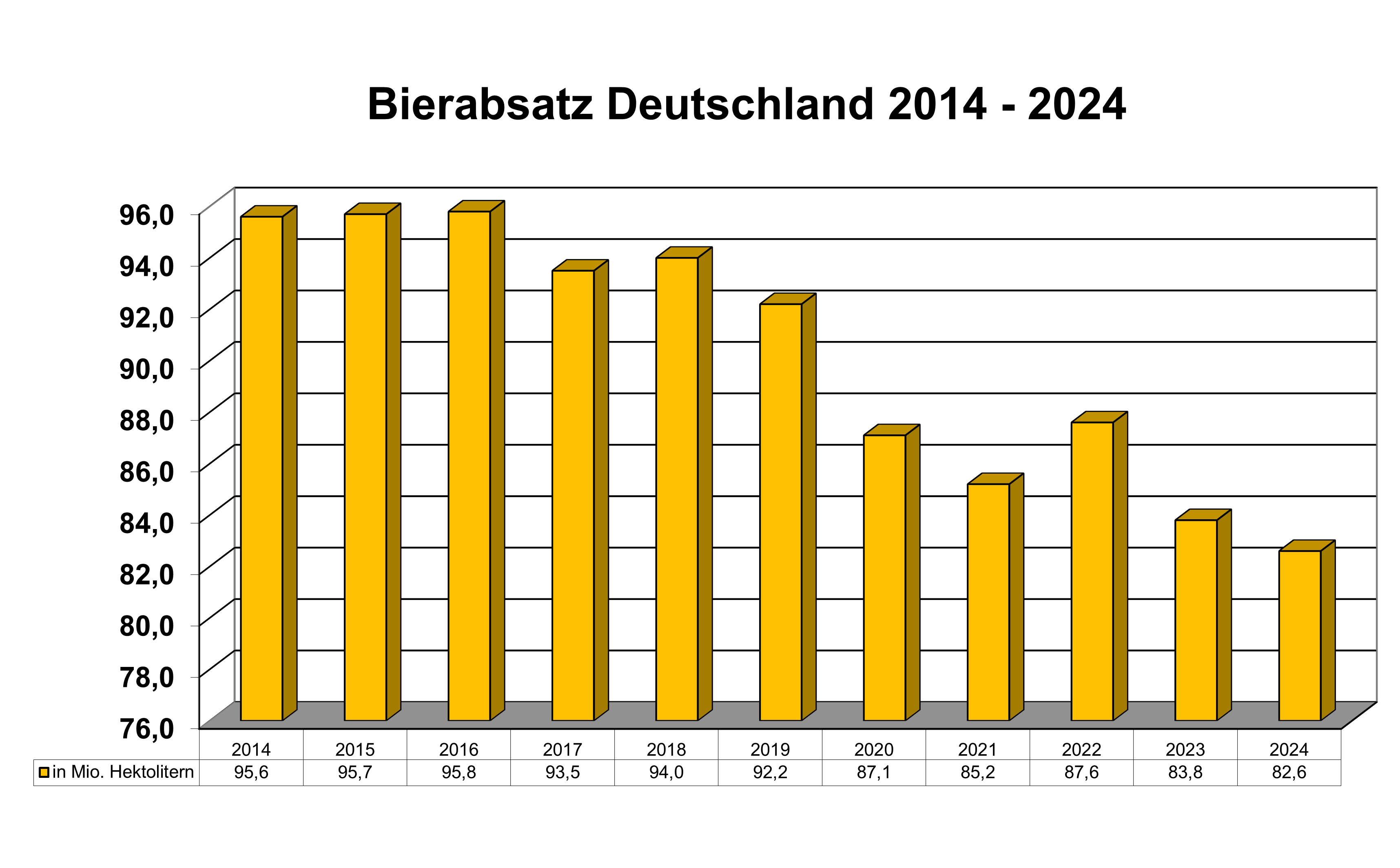 Die gesamtdeutsche Brauwirtschaft hat im Jahr 2024 82,6 Millionen Hektoliter Bier abgesetzt. Dies entspricht gegenüber dem Vorjahr einem Absatzminus von 1,4 %. Vor Beginn der Corona-Pandemie setzte die Branche bundesweit noch 92,2 Millionen Hektoliter Bier ab. Innerhalb von 5 Jahren hat die Branche damit fast 10 Millionen Hektoliter Absatz verloren. Der Anteil alkoholfreier Biere ist in den letzten Jahren demgegenüber kontinuierlich gewachsen.